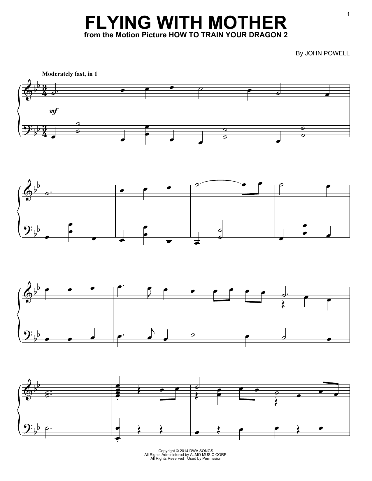 Download or print John Powell Flying With Mother (from How to Train Your Dragon 2) sheet music, chords and digital score arranged for Piano Solo. This Film/TV score includes 6 page(s).