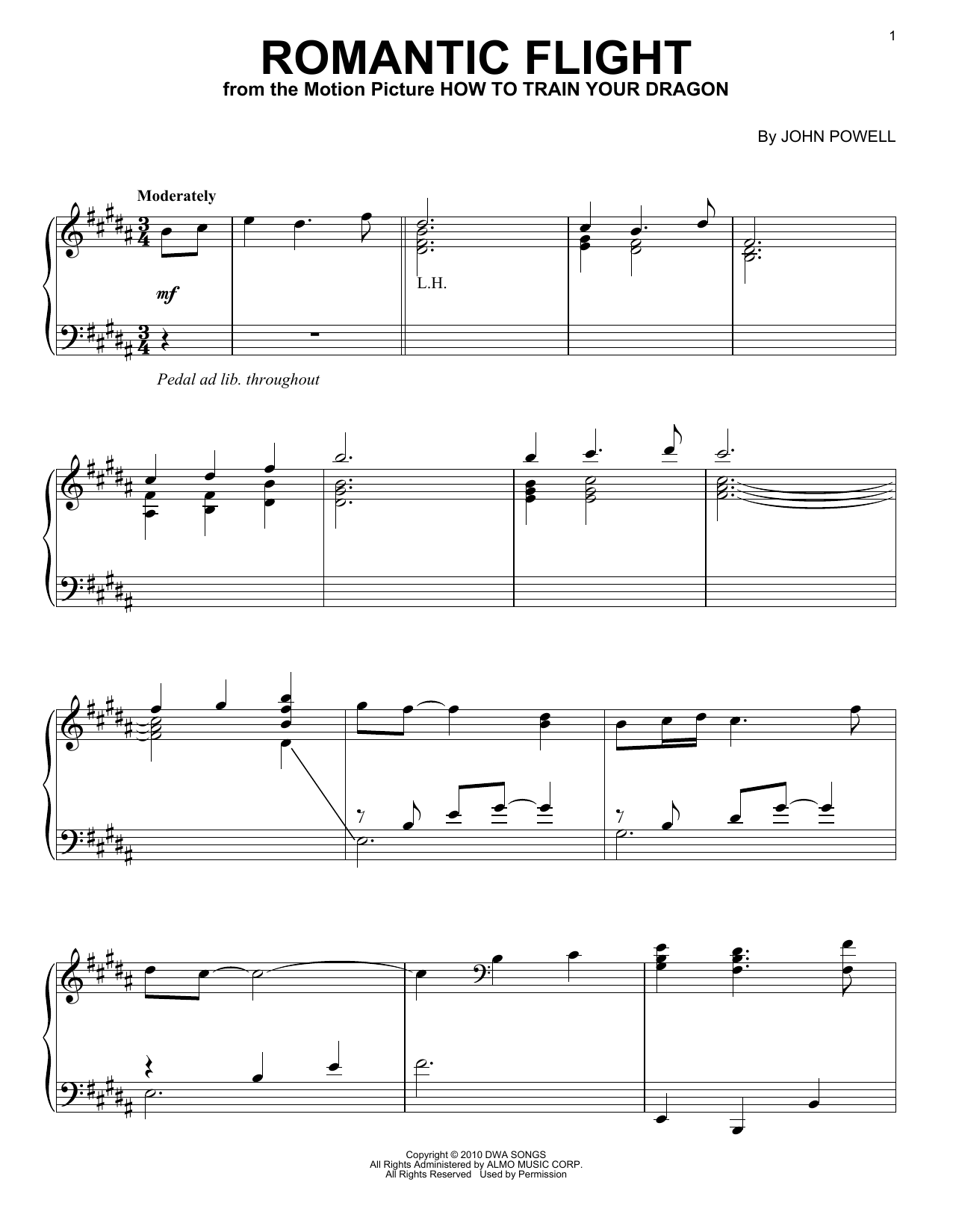 Download or print John Powell Romantic Flight (from How to Train Your Dragon) sheet music, chords and digital score arranged for Piano Solo. This Children score includes 4 page(s).