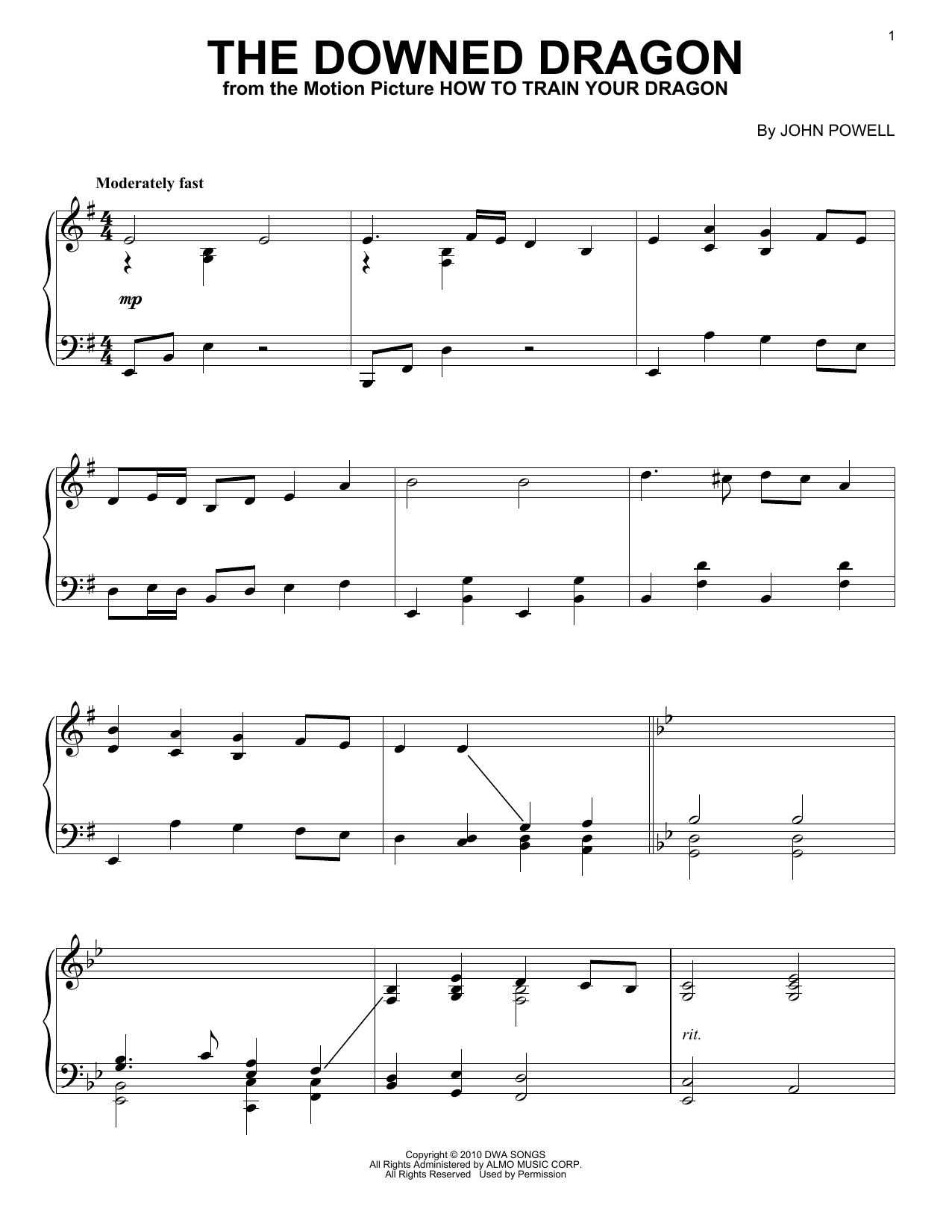 Download or print John Powell The Downed Dragon (from How to Train Your Dragon) sheet music, chords and digital score arranged for Piano Solo. This Children score includes 2 page(s).