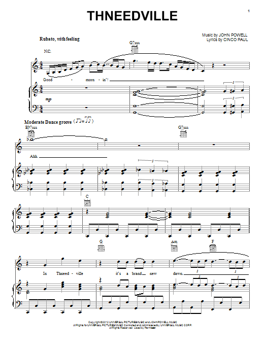 Download or print John Powell Thneedville sheet music, chords and digital score arranged for Piano, Vocal & Guitar Chords (Right-Hand Melody). This Children score includes 7 page(s).