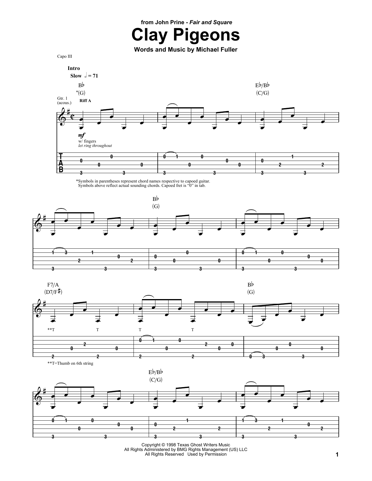 Download or print John Prine Clay Pigeons sheet music, chords and digital score arranged for Guitar Tab. This Pop score includes 5 page(s).