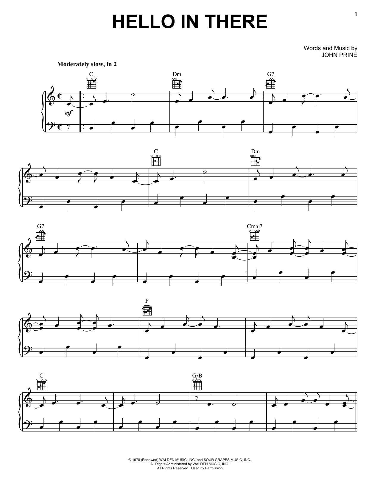 Download or print John Prine Hello In There sheet music, chords and digital score arranged for Piano, Vocal & Guitar Chords (Right-Hand Melody). This Pop score includes 6 page(s).