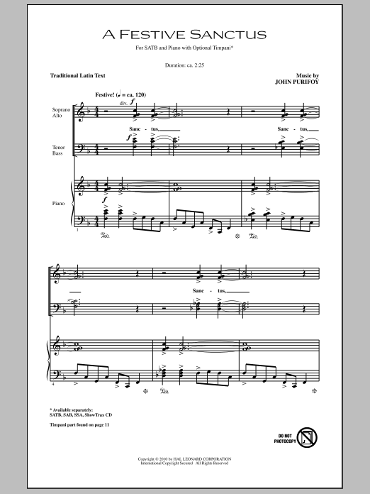 Download or print John Purifoy A Festive Sanctus sheet music, chords and digital score arranged for SSA Choir. This Concert score includes 9 page(s).