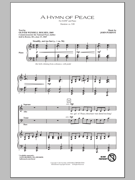 Download or print John Purifoy A Hymn Of Peace sheet music, chords and digital score arranged for SSA Choir. This Concert score includes 7 page(s).