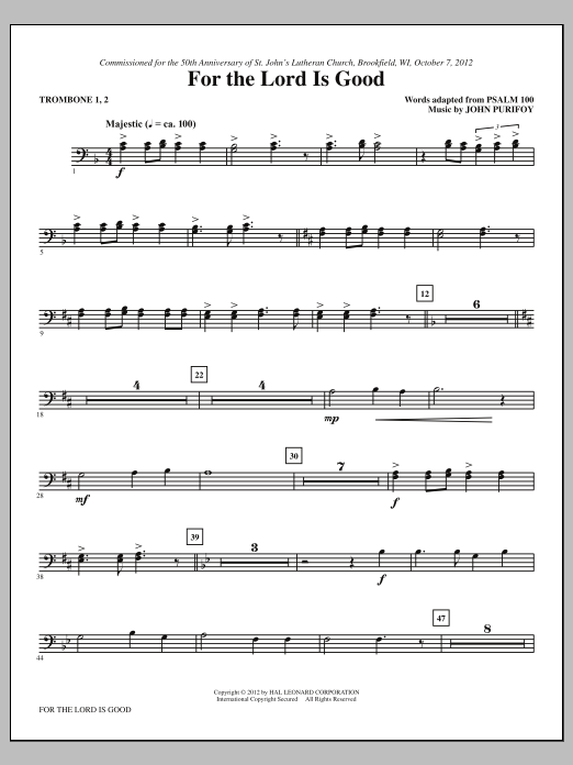 Download or print John Purifoy For The Lord Is Good - Trombone 1, 2 sheet music, chords and digital score arranged for Choir Instrumental Pak. This Pop score includes 10 page(s).
