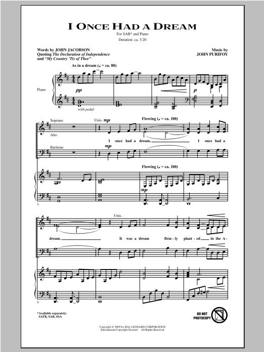 Download or print John Purifoy I Once Had A Dream sheet music, chords and digital score arranged for SAB Choir. This Concert score includes 7 page(s).