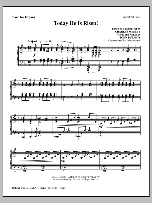 Download or print John Purifoy Today He Is Risen! - Piano or Organ sheet music, chords and digital score arranged for Choir Instrumental Pak. This Easter score includes 4 page(s).