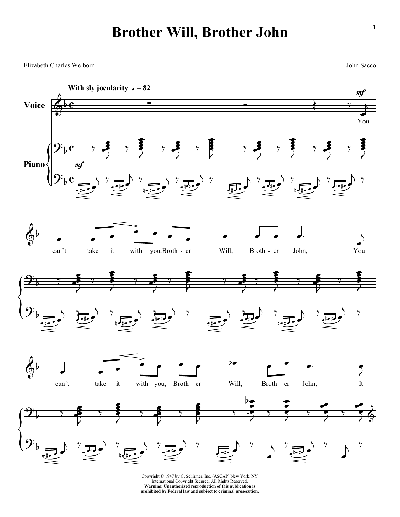 Download or print John Sacco Brother Will, Brother John sheet music, chords and digital score arranged for Piano & Vocal. This American score includes 6 page(s).
