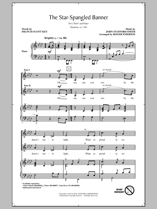 Download or print Francis Scott Key The Star Spangled Banner (arr. Roger Emerson) sheet music, chords and digital score arranged for 2-Part Choir. This Patriotic score includes 10 page(s).