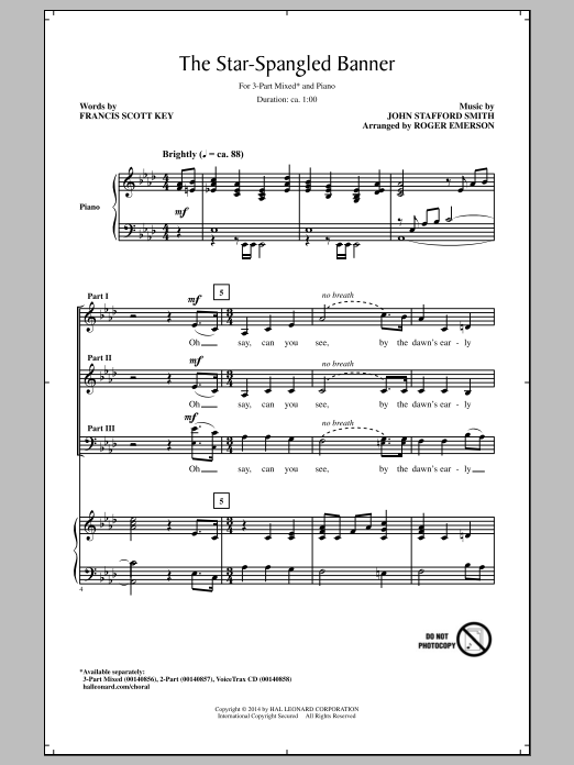 Download or print John Stafford Smith The Star Spangled Banner (arr. Roger Emerson) sheet music, chords and digital score arranged for 3-Part Mixed Choir. This Patriotic score includes 10 page(s).