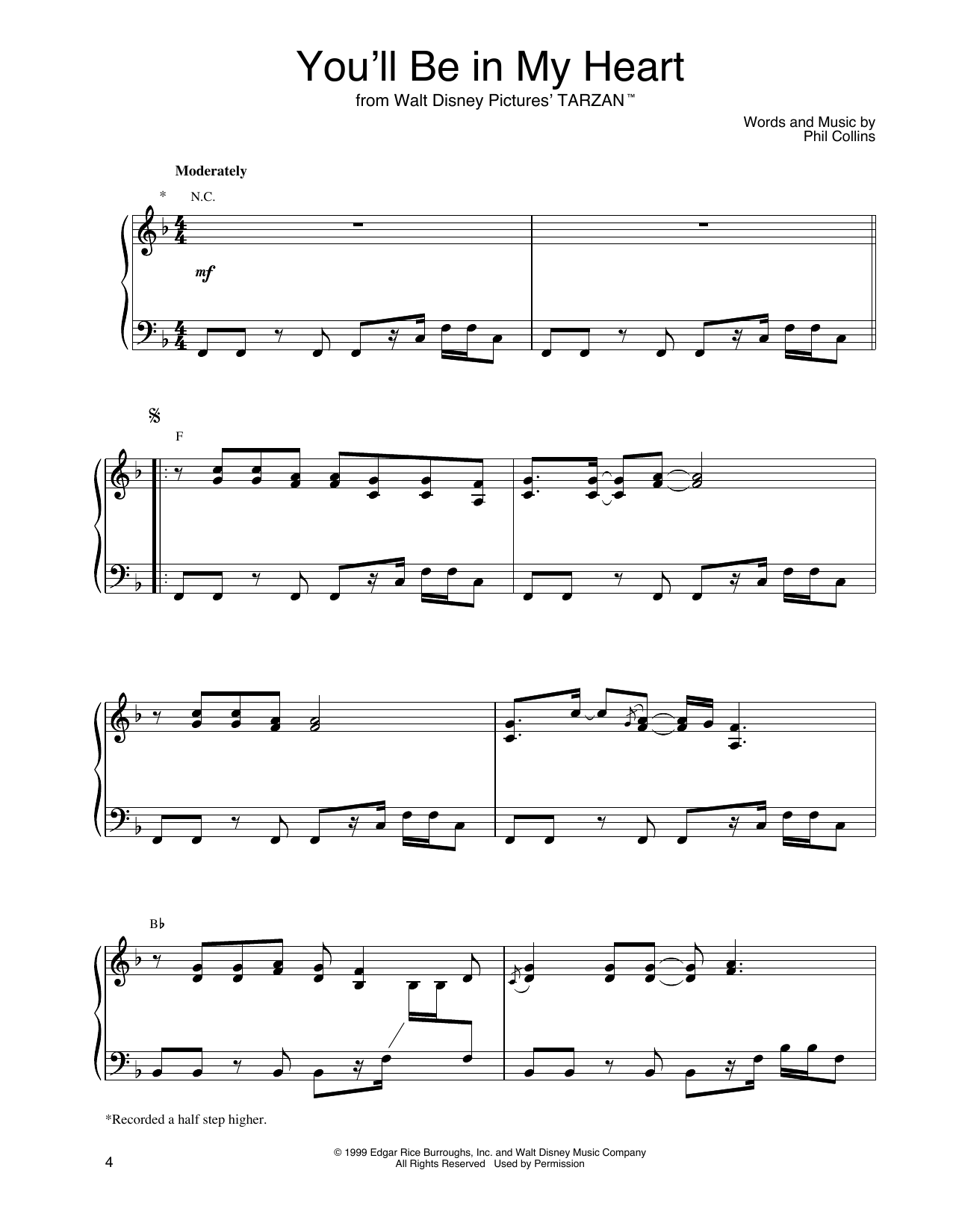 Download or print John Tesh You'll Be In My Heart (from Tarzan) sheet music, chords and digital score arranged for Piano Solo. This Disney score includes 6 page(s).