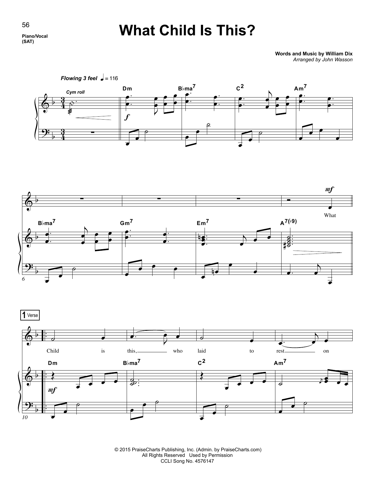 Download or print John Wasson What Child Is This? sheet music, chords and digital score arranged for Piano & Vocal. This Christmas score includes 7 page(s).