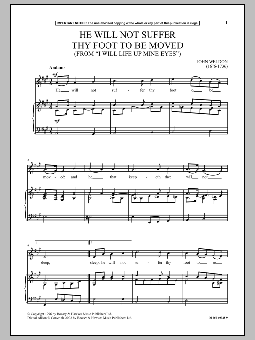 Download or print John Weldon He Will Not Suffer Thy Foot To Be Moved (from I Will Lift Up Mine Eyes) sheet music, chords and digital score arranged for Piano & Vocal. This Classical score includes 2 page(s).