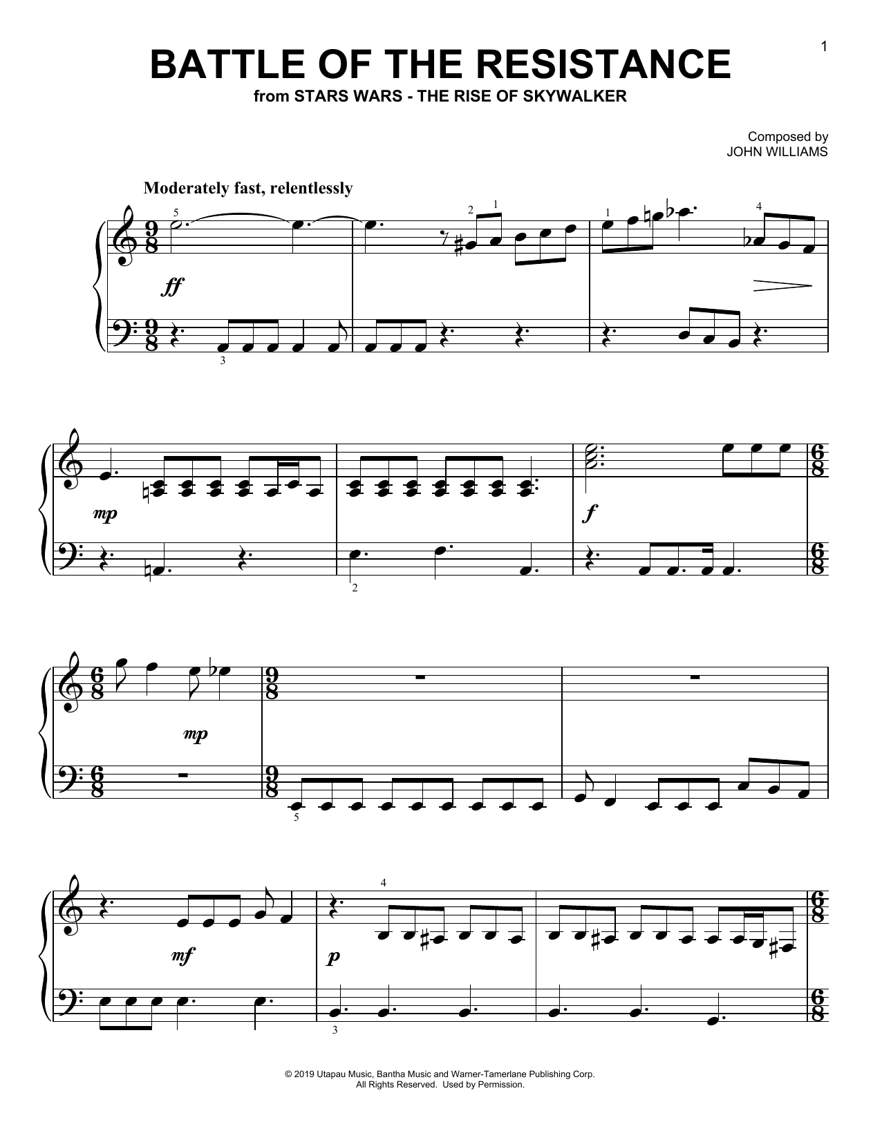 Download or print John Williams Battle Of The Resistance (from The Rise Of Skywalker) sheet music, chords and digital score arranged for Piano Solo. This Disney score includes 6 page(s).