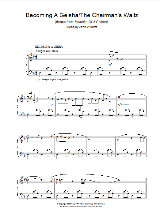 Download or print John Williams Becoming A Geisha/The Chairman's Waltz (theme from Memoirs Of A Geisha) sheet music, chords and digital score arranged for Piano Solo. This Film/TV score includes 6 page(s).