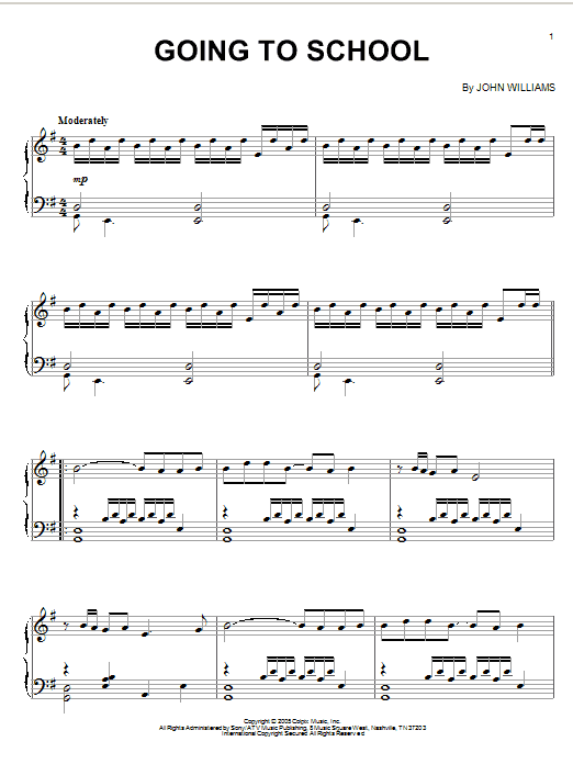 Download or print John Williams Going To School sheet music, chords and digital score arranged for Piano Solo. This Film/TV score includes 4 page(s).