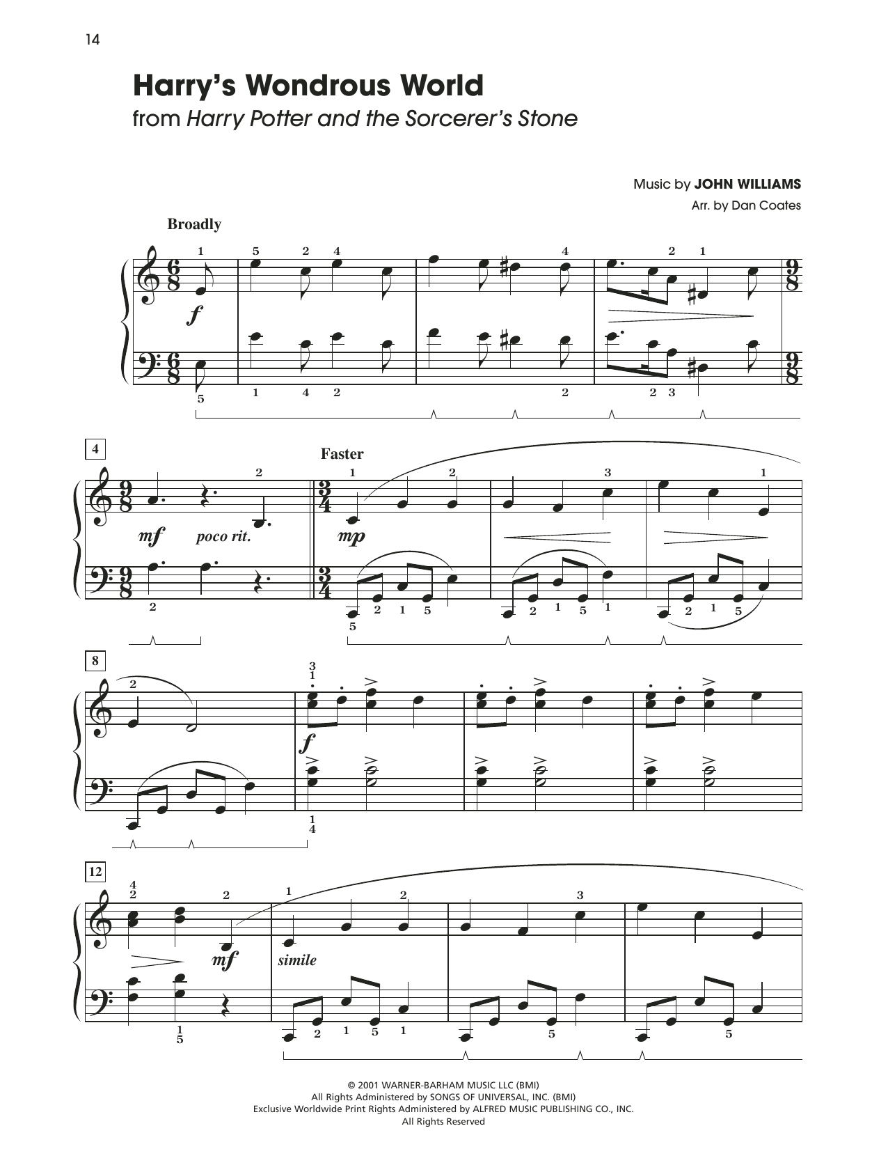 Download or print John Williams Harry's Wondrous World (from Harry Potter) (arr. Dan Coates) sheet music, chords and digital score arranged for Easy Piano. This Film/TV score includes 4 page(s).