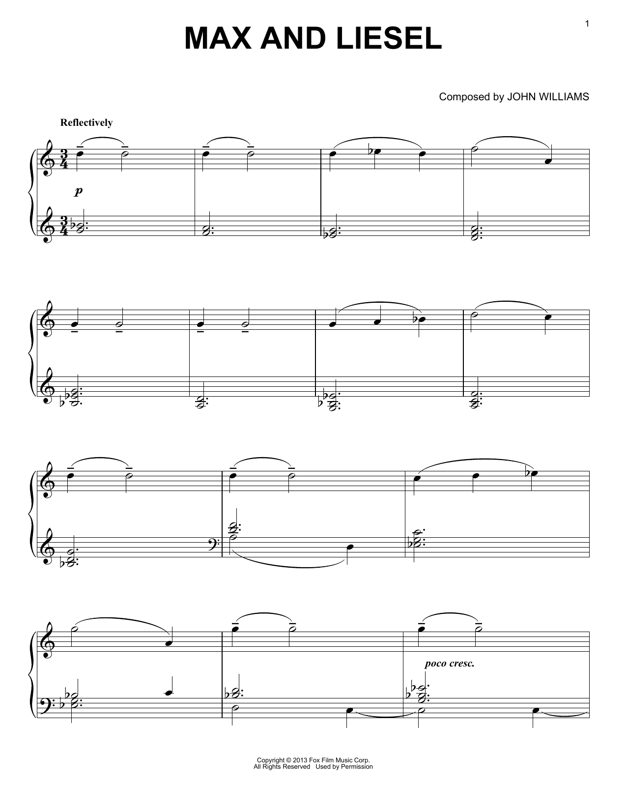 Download or print John Williams Max And Liesel sheet music, chords and digital score arranged for Piano Solo. This Film/TV score includes 2 page(s).