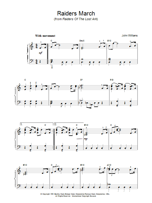 Download or print John Williams Raiders March sheet music, chords and digital score arranged for Easy Piano. This Classical score includes 6 page(s).