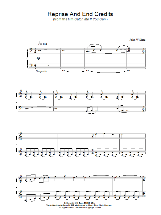 Download or print John Williams Reprise And End Credits (from Catch Me If You Can) sheet music, chords and digital score arranged for Piano Solo. This Classical score includes 12 page(s).
