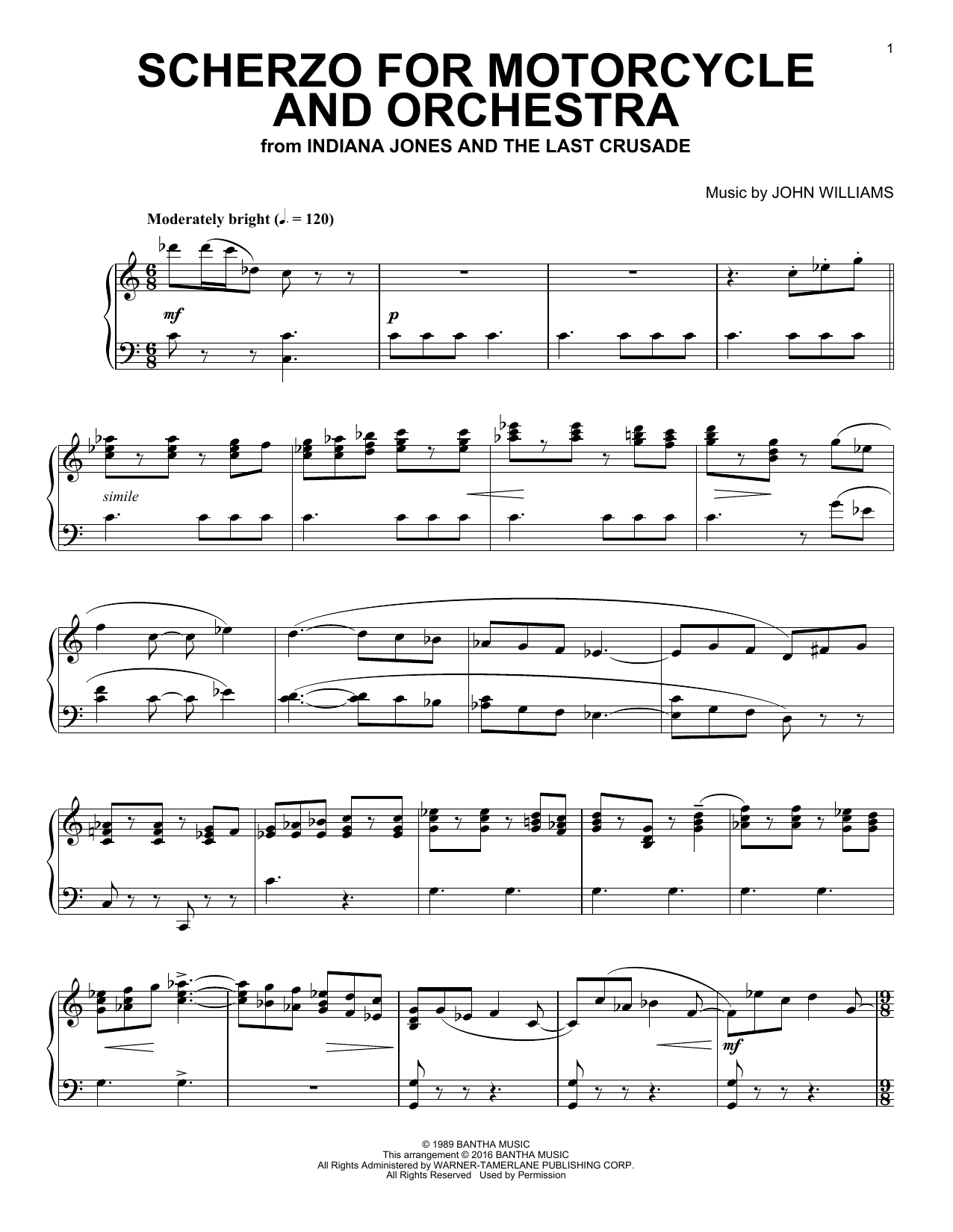 Download or print John Williams Scherzo For Motorcycle And Orchestra sheet music, chords and digital score arranged for Piano Solo. This Classical score includes 7 page(s).