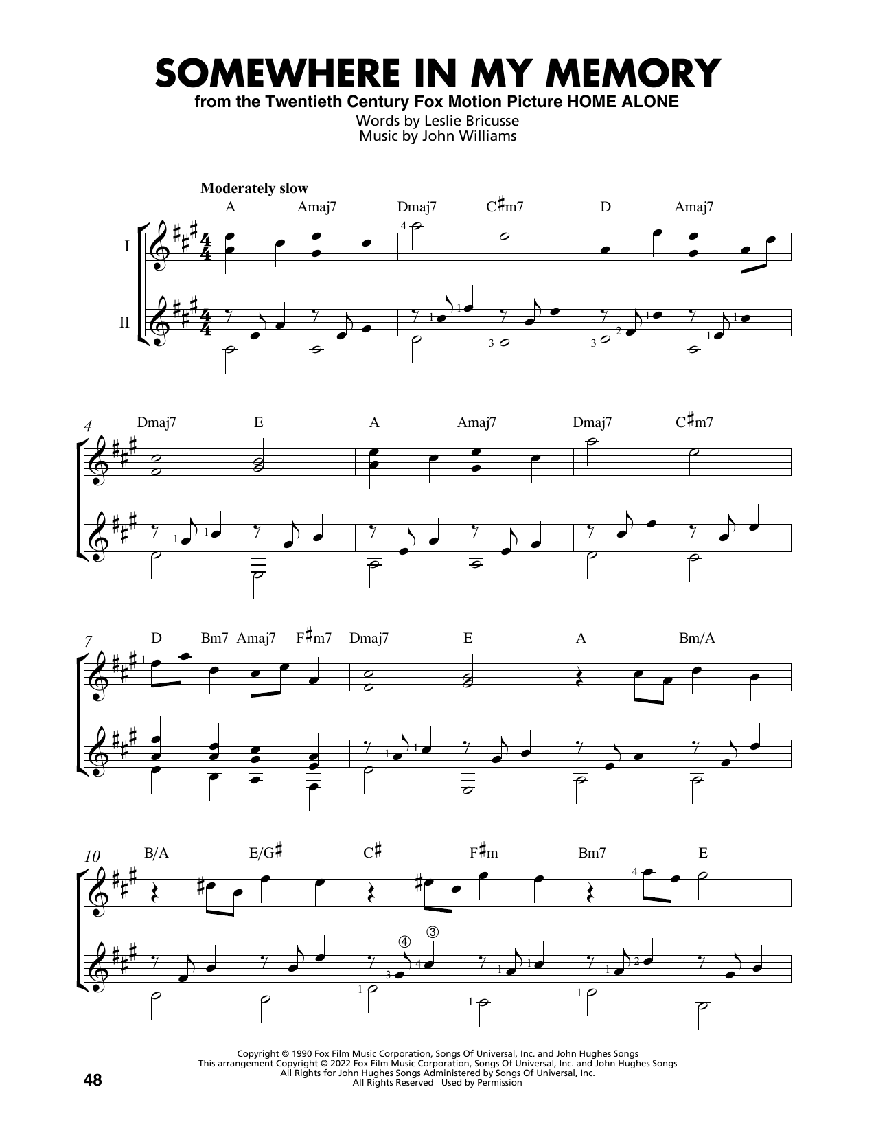 Download or print John Williams Somewhere In My Memory (from Home Alone) (arr. Mark Phillips) sheet music, chords and digital score arranged for Easy Guitar Tab. This Christmas score includes 2 page(s).
