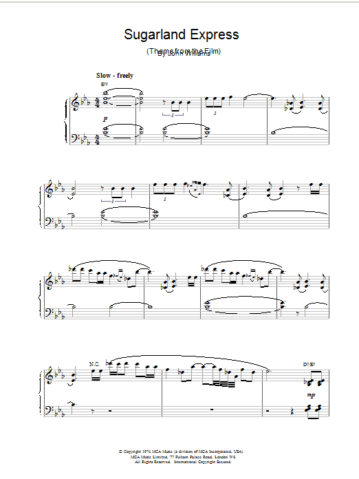 Download or print John Williams Sugarland Express sheet music, chords and digital score arranged for Piano Solo. This Film/TV score includes 4 page(s).
