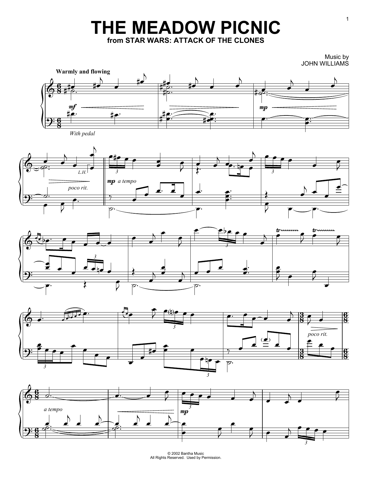Download or print John Williams The Meadow Picnic (from Star Wars: Attack Of The Clones) sheet music, chords and digital score arranged for Piano Solo. This Film/TV score includes 2 page(s).