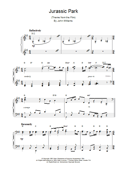 Download or print John Williams Jurassic Park sheet music, chords and digital score arranged for Piano Solo. This Film/TV score includes 4 page(s).
