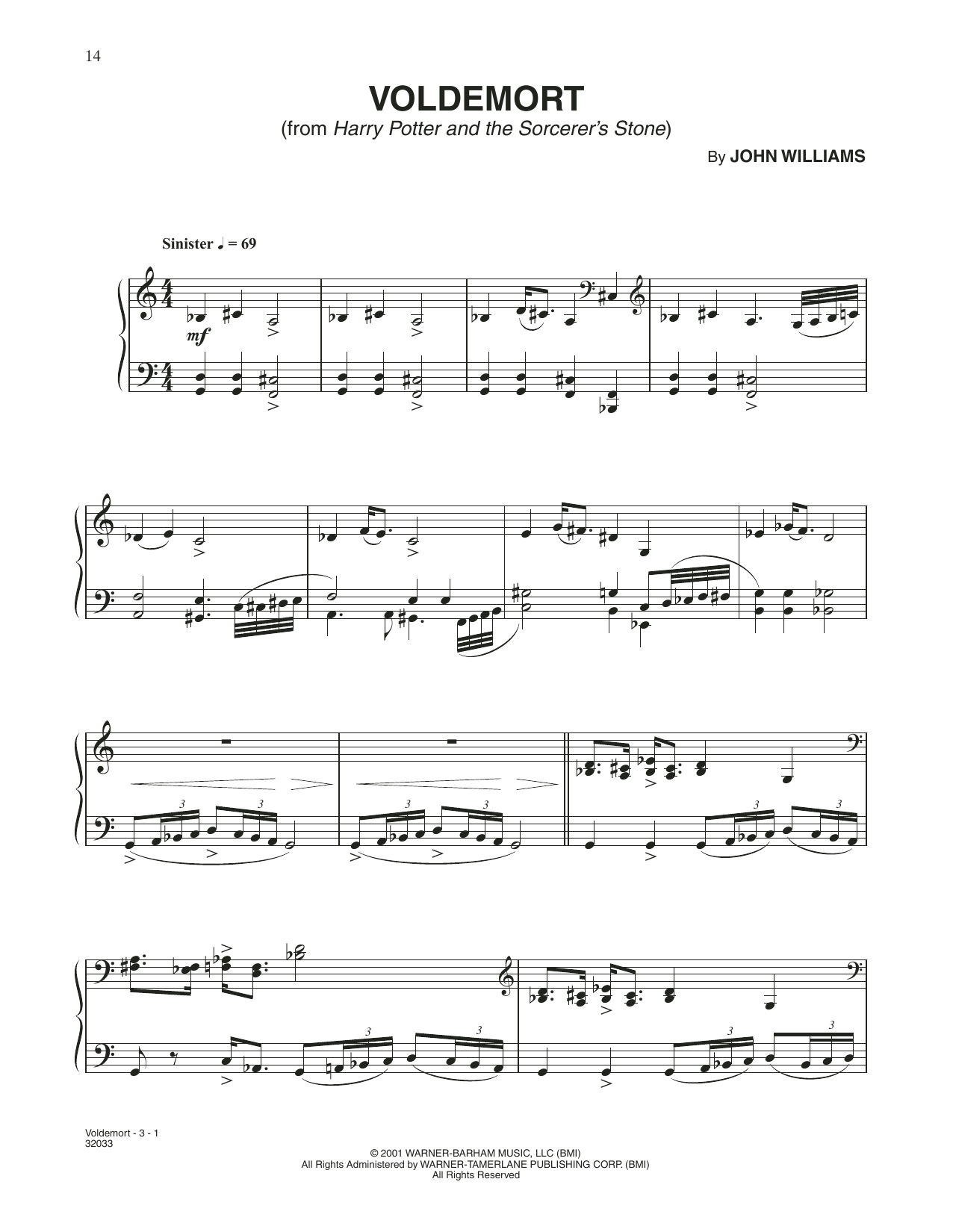 Download or print John Williams Voldemort (from Harry Potter) sheet music, chords and digital score arranged for Piano Solo. This Film/TV score includes 3 page(s).