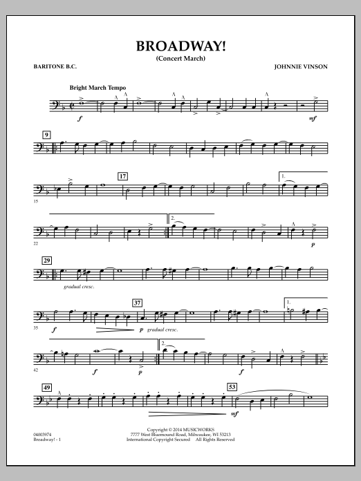 Download or print Johnnie Vinson Broadway! - Baritone B.C. sheet music, chords and digital score arranged for Concert Band. This Pop score includes 2 page(s).