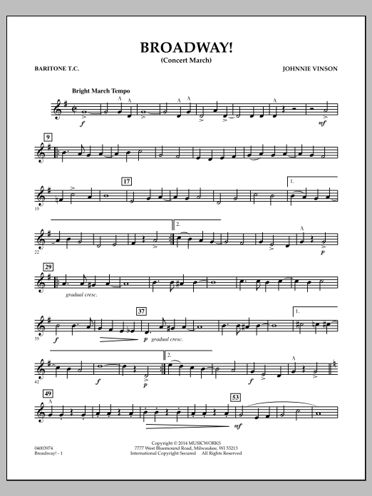 Download or print Johnnie Vinson Broadway! - Baritone T.C. sheet music, chords and digital score arranged for Concert Band. This Pop score includes 2 page(s).