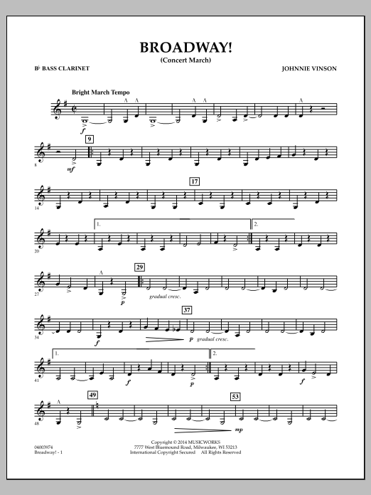 Download or print Johnnie Vinson Broadway! - Bb Bass Clarinet sheet music, chords and digital score arranged for Concert Band. This Pop score includes 2 page(s).