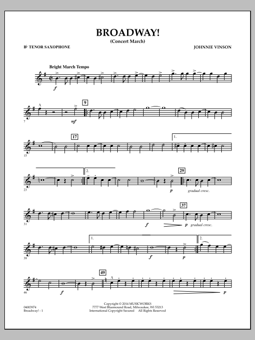 Download or print Johnnie Vinson Broadway! - Bb Tenor Saxophone sheet music, chords and digital score arranged for Concert Band. This Pop score includes 2 page(s).