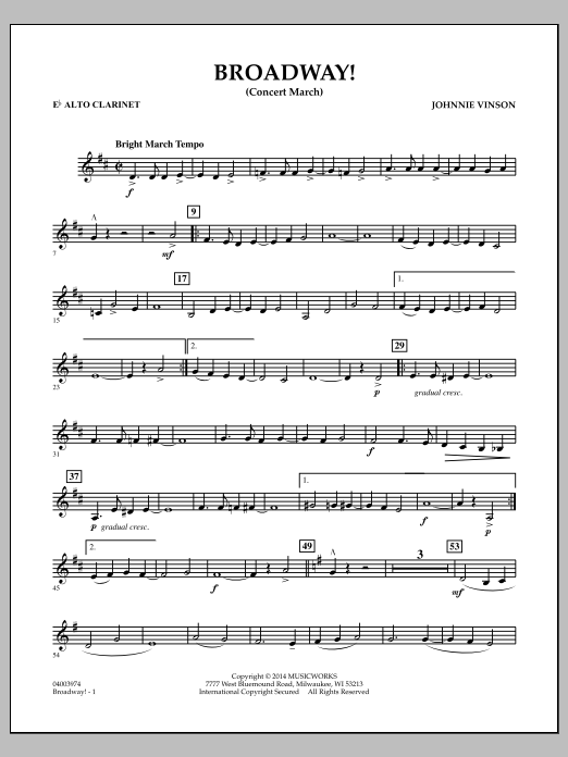 Download or print Johnnie Vinson Broadway! - Eb Alto Clarinet sheet music, chords and digital score arranged for Concert Band. This Pop score includes 2 page(s).