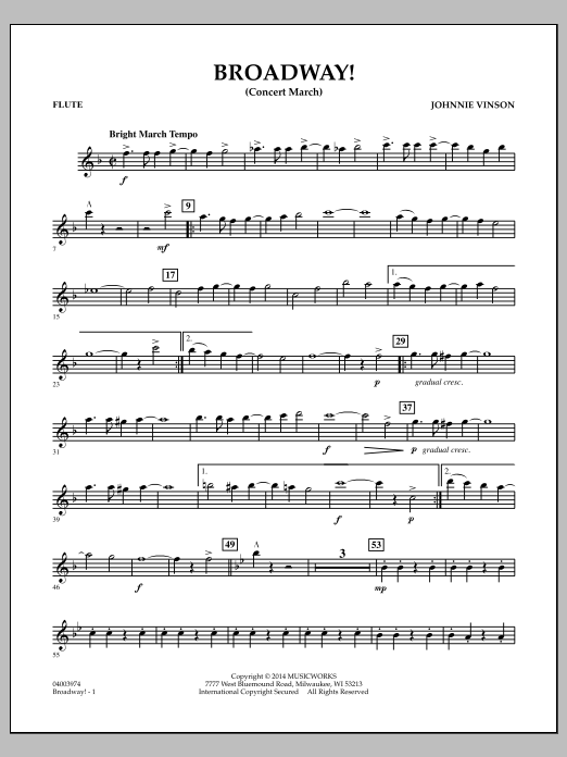 Download or print Johnnie Vinson Broadway! - Flute sheet music, chords and digital score arranged for Concert Band. This Pop score includes 2 page(s).