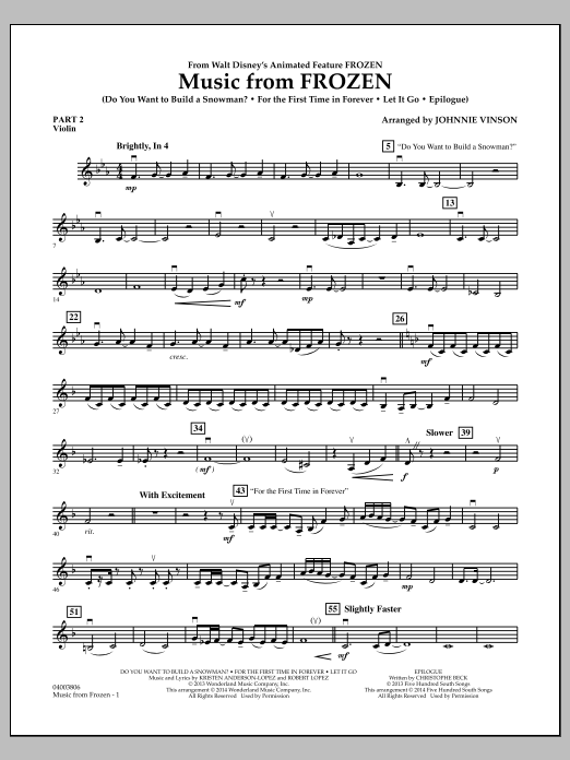 Download or print Johnnie Vinson Music from "Frozen" - Pt.2 - Violin sheet music, chords and digital score arranged for Concert Band: Flex-Band. This Children score includes 2 page(s).