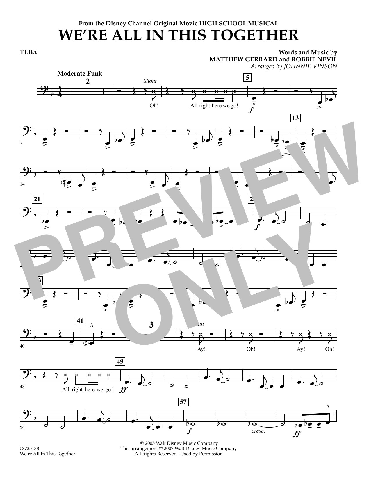 Download or print Johnnie Vinson We're All In This Together (from High School Musical) - Tuba sheet music, chords and digital score arranged for Concert Band. This Children score includes 1 page(s).