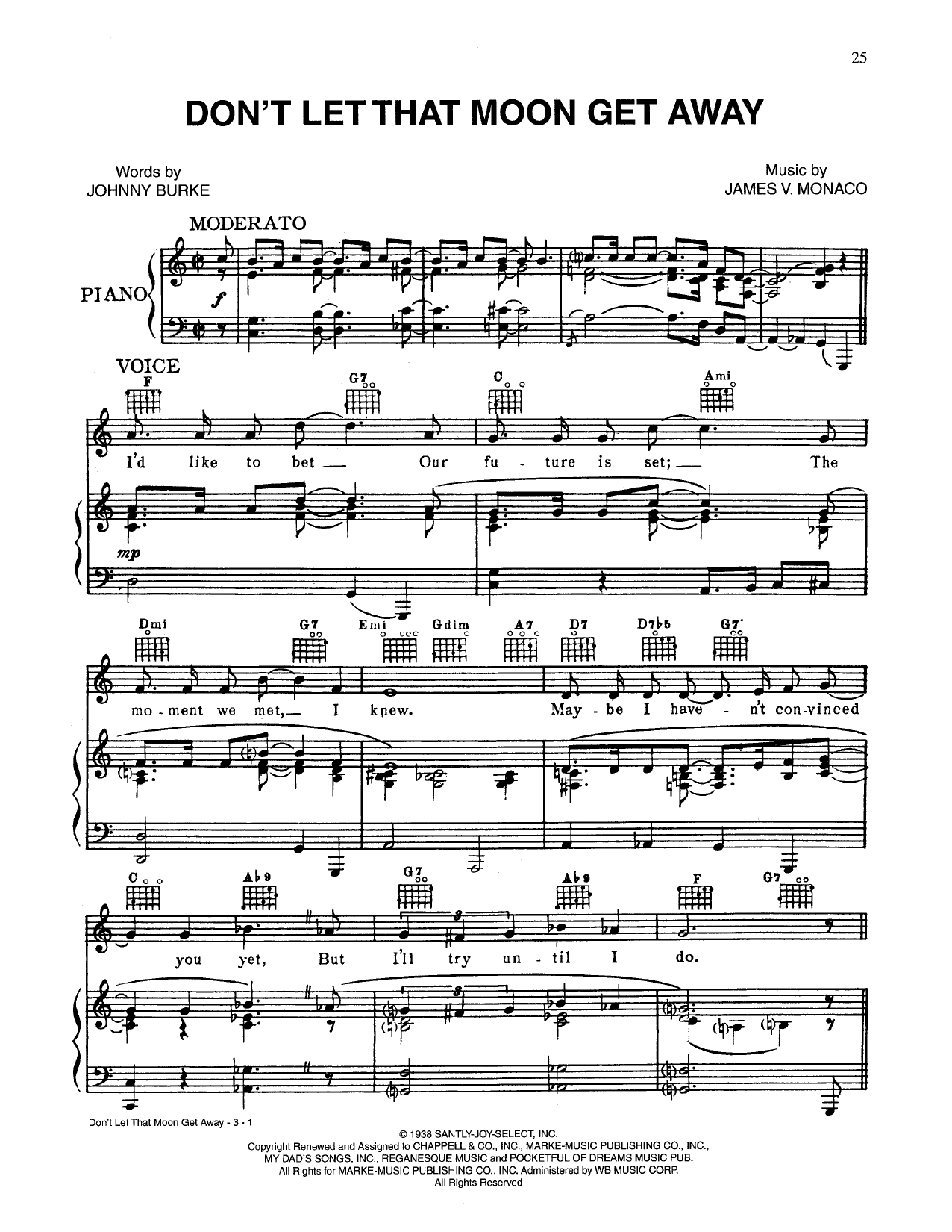 Download or print Johnny Burke Don't Let That Moon Get Away sheet music, chords and digital score arranged for Piano, Vocal & Guitar Chords (Right-Hand Melody). This Pop score includes 3 page(s).
