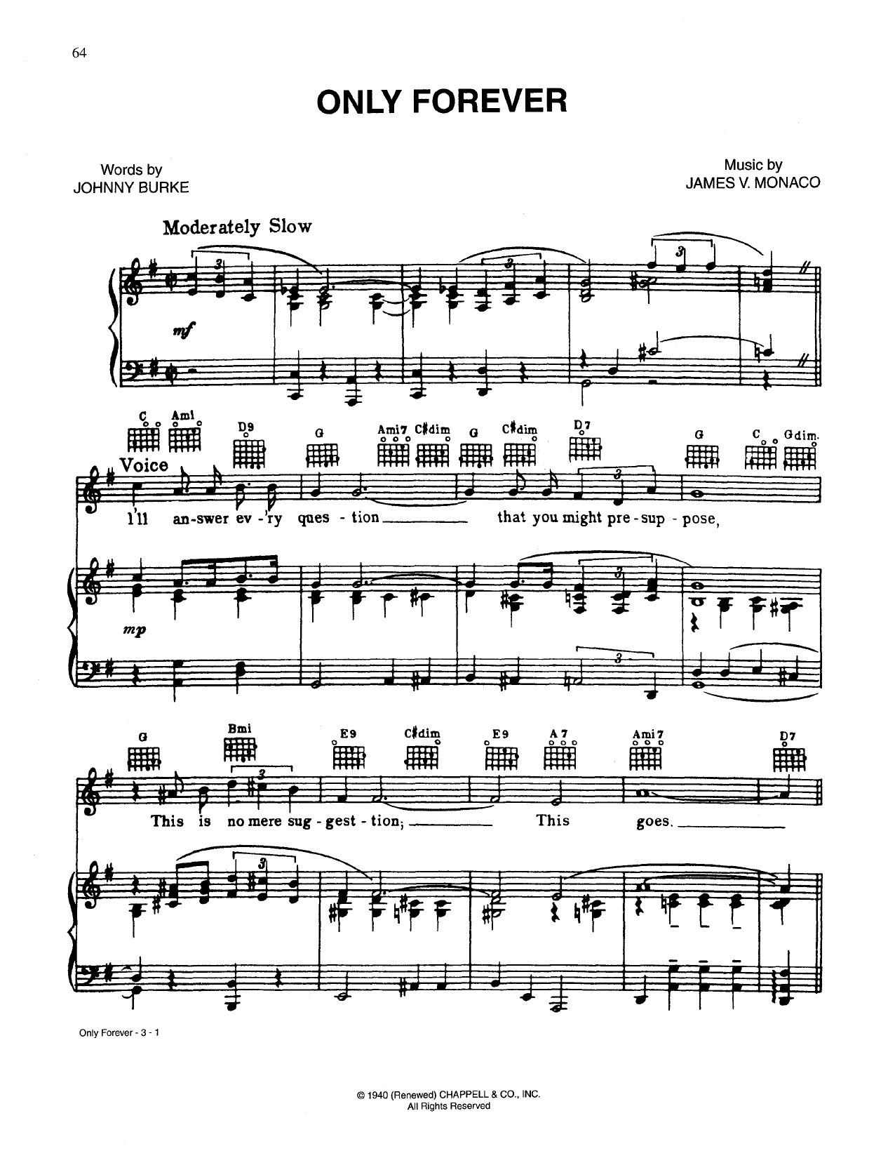 Download or print Johnny Burke Only Forever sheet music, chords and digital score arranged for Piano, Vocal & Guitar Chords (Right-Hand Melody). This Pop score includes 3 page(s).