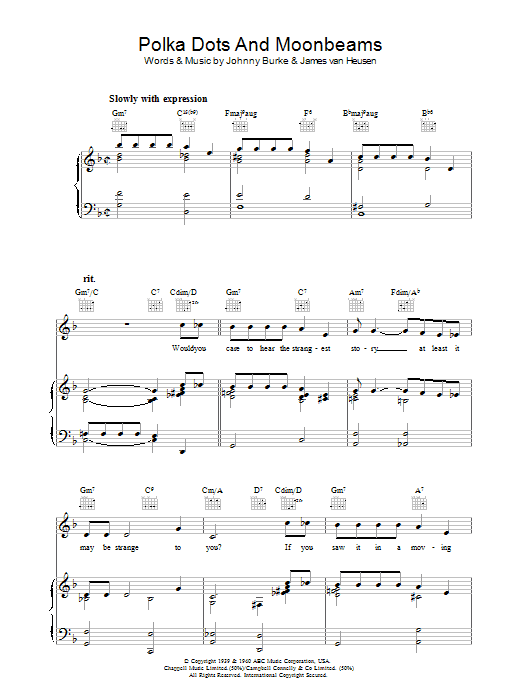 Download or print Johnny Burke Polka Dots And Moonbeams sheet music, chords and digital score arranged for Piano, Vocal & Guitar Chords. This Pop score includes 6 page(s).