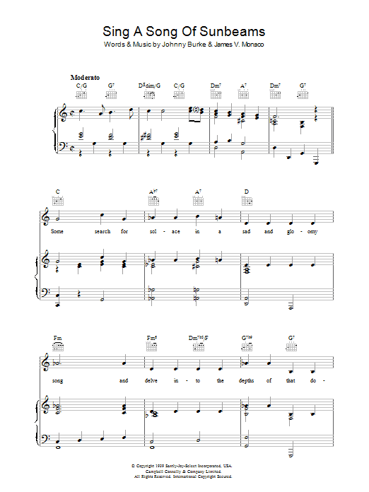 Download or print Johnny Burke Sing A Song Of Sunbeams sheet music, chords and digital score arranged for Piano, Vocal & Guitar Chords. This Pop score includes 7 page(s).
