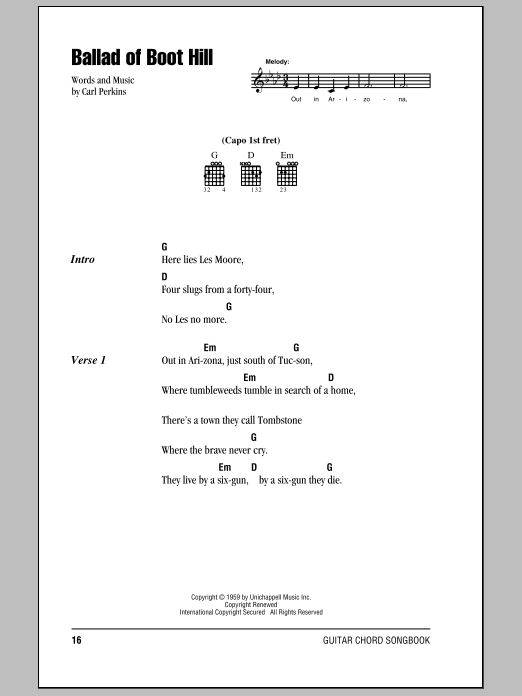 Download or print Johnny Cash Ballad Of Boot Hill sheet music, chords and digital score arranged for Piano, Vocal & Guitar Chords (Right-Hand Melody). This Country score includes 5 page(s).