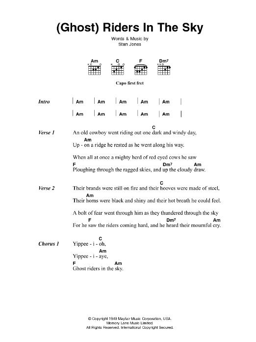 Download or print Johnny Cash Ghost Riders In The Sky sheet music, chords and digital score arranged for Guitar Chords/Lyrics. This Country score includes 2 page(s).