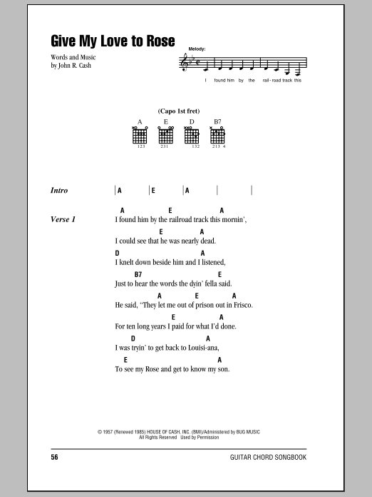 Download or print Johnny Cash Give My Love To Rose sheet music, chords and digital score arranged for Piano, Vocal & Guitar Chords (Right-Hand Melody). This Country score includes 4 page(s).