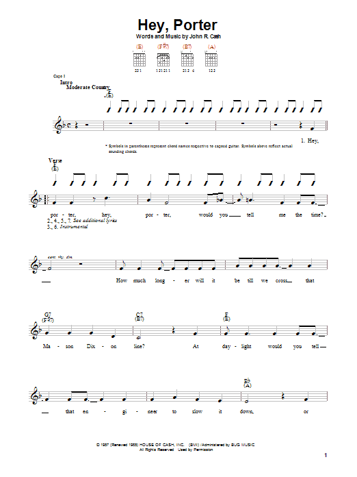 Download or print Johnny Cash Hey, Porter sheet music, chords and digital score arranged for Guitar Tab. This Country score includes 6 page(s).