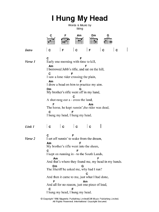 Download or print Johnny Cash I Hung My Head sheet music, chords and digital score arranged for Guitar Chords/Lyrics. This Country score includes 2 page(s).