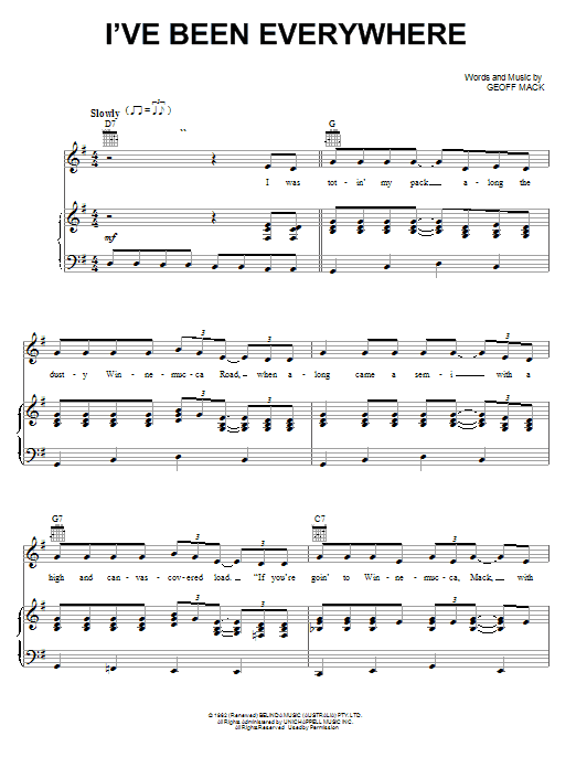 Download or print Johnny Cash I've Been Everywhere sheet music, chords and digital score arranged for Piano, Vocal & Guitar Chords (Right-Hand Melody). This Country score includes 5 page(s).