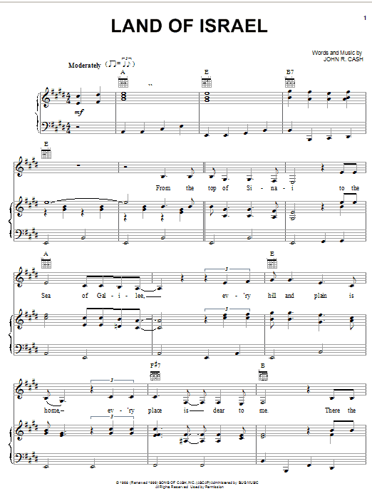 Download or print Johnny Cash Land Of Israel sheet music, chords and digital score arranged for Piano, Vocal & Guitar Chords (Right-Hand Melody). This Christian score includes 5 page(s).