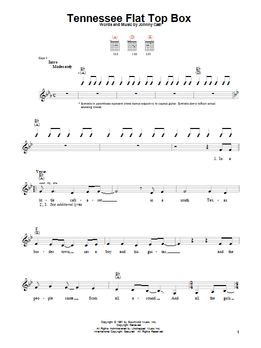 Download or print Johnny Cash Tennessee Flat-top Box sheet music, chords and digital score arranged for Guitar Chords/Lyrics. This Country score includes 2 page(s).